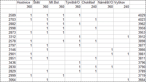 Další fází bylo najít vhodné bodování. (Tabulku, ze které jsem vycházel, najdete na konci zprávy.) Chtěl jsem, aby příliš nezáleželo na počtu projetých stanic - protože to dává víc možností. Z toho mi vyšlo 360 bodů za stanici. Trápily mě pouze Vyškov a Chotěboř. Vyškov dával vysoké body i na poměrně jednoduchých trasách. Takže určitě s body dolů. Chotěboř za 360 se mi nelíbila z jiných důvodů. Trasy s Chotěboří bodově vyčnívaly, ale na první pohled není vidět, že by Chotěboř měla být lepší než třeba Týniště. Za jiných okolností bych tam těch 360 bodů nejspíš nechal. Ale bál jsem se, aby tam Honza s Davidem nevyrazili spolu hned ze startu, pak by měli 4 hodiny na vymyšlení zbytku a zřejmě už by spolu i dojeli. Takže nerad, ale s body taky dolů. Dokonce jsem i zvažoval Chotěboř úplně vyškrtnou a zůstat u šesti stanic. Nakonec jsem Chotěboř a Vyškov snížil na 240. Na opačnou stranu vyčnívala Náměšť, trasy nic moc, takže by si zasloužila víc bodů, ale tři různé bodové hodnoty jsem nechtěl dávat. Výsledek se mi líbil, měl jsem na předních příčkách hodně vyrovnané různé trasy, včetně třeba trasy přes Mšeno.
